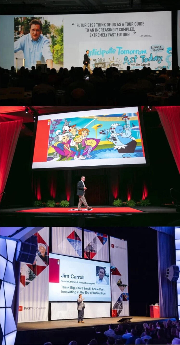As a futurist and innovation thought leader for 30+ years, Jim has headlined dozens of financial association events, as well as dozens of CEO-level corporate leadership meetings for financial services companies.A few examples? American Express, Blackrock, Visa, Fidelity, the World Bank, and multiple private wealth management and investing companies - the world's leaders turn to Jim Carroll when they need a powerful kickoff for a strategic leadership meetings.